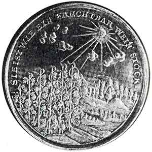 und die Zahl der Trauben für die Zahl der Kinder. Der sonnenbeschienene Weinberg war das Symbol für Gottes Segen oder auf Belobigungsmedaillen Ergebnis des Fleißes. Zuletzt ist die Rebe, an der eine aus den Wolken kommende Hand Trauben pflückt, Zeichen für das Ableben auf Sterbemedaillen.